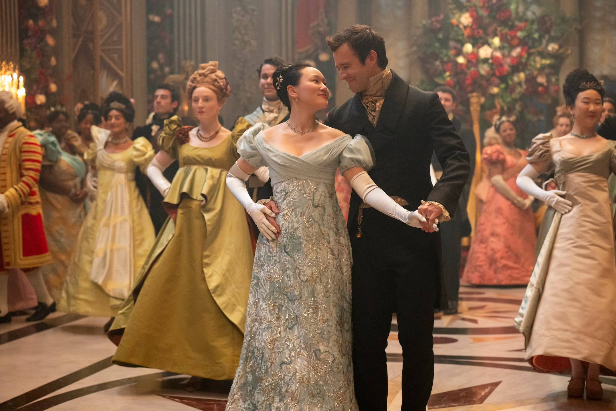 While Sophie drifted through in silver uncertainty, other characters arrived in bold, unmistakable costumes — Lady Danbury (Adjoa Andoh) as Zeus, Eloise Bridgerton (Claudia Jessie) as Joan of Arc with a distinctive bob. “Those are straightforward looks,” Glaser says. “You remember Cleopatra’s mask. You remember Joan of Arc. But can you describe what Sophie’s silver dress looked like? Not really. Silver. And that’s the idea — she is a little blurrier. You’re not really sure what it is over there.”