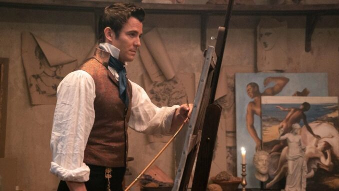 Benedict, unknowingly intoxicated after drinking tea brought back from Colin Bridgerton’s travels, receives news that he has been accepted into the Royal Academy Schools in Season 2, Episode 3, “A Bee in Your Bonnet” (56:44–58:30)