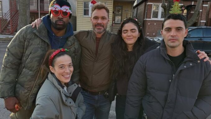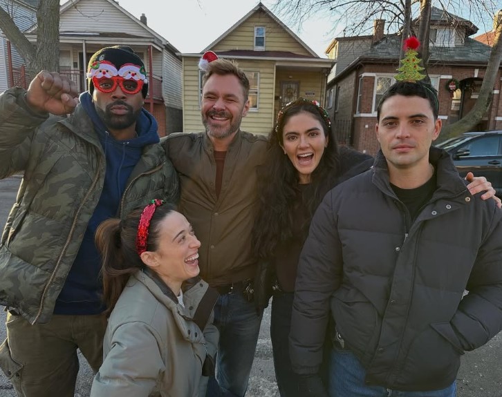 Squerciati was joined by some of the core squad, LaRoyce Hawkins (Atwater), Patrick John Flueger (Ruzek), Benjamin Levy Aguilar (Torres), and the newest addition Arienne Mandi (Cook). Instead of a polished promo shot, the carousel of photos shows a group that simply cannot keep it together.
