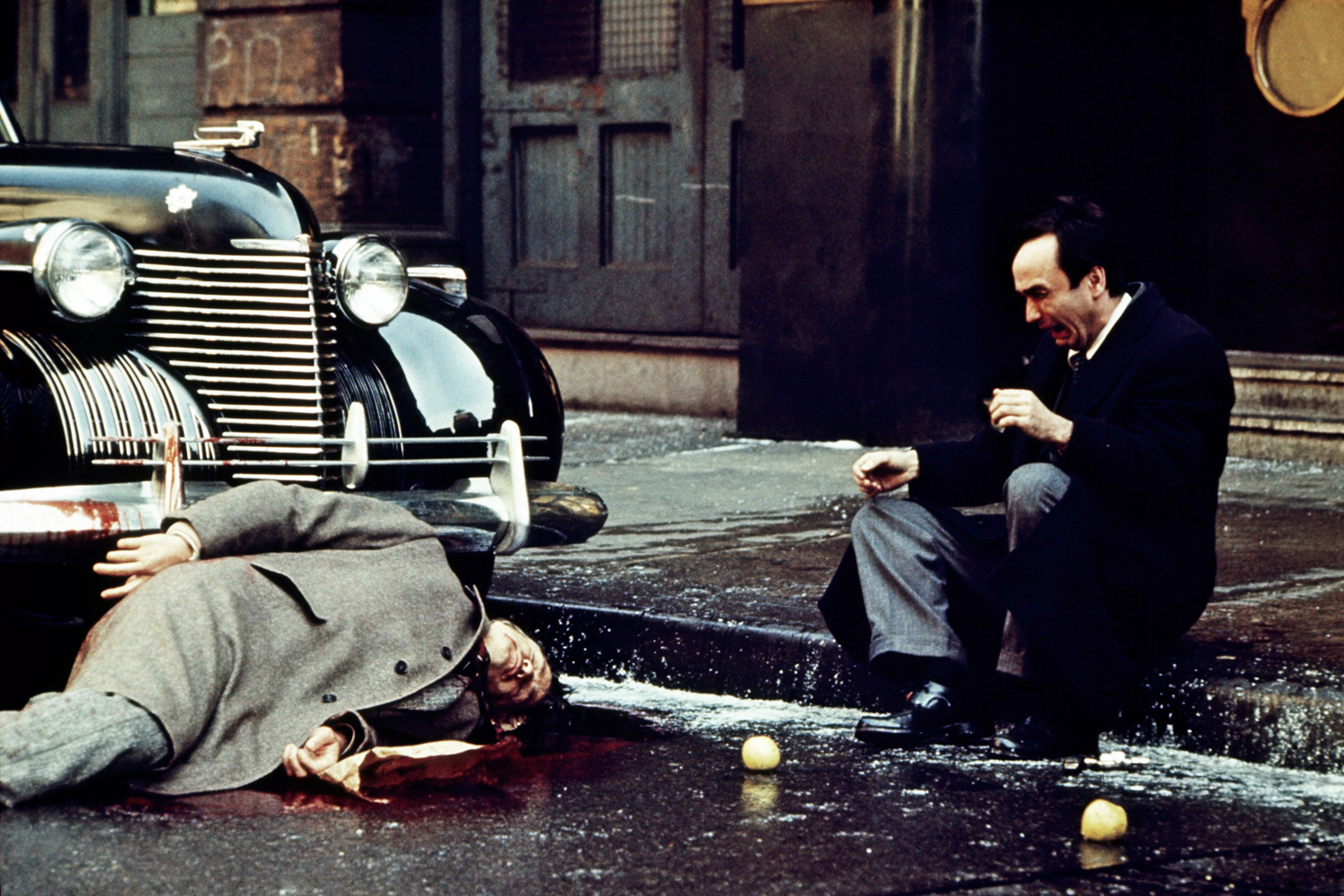 The assassins open fire, unleashing multiple bullets into the aging Don, who collapses beside the fruit stand as oranges scatter across the pavement.