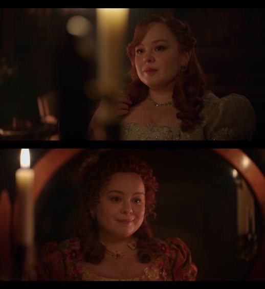 One of the most powerful moments in Season 4 happens when Penelope stands in front of a mirror before attending Cressida Cowper’s ball with her husband, Colin Bridgerton. It’s not just a quiet moment of preparation. It’s a symbolic confrontation between her past and present.